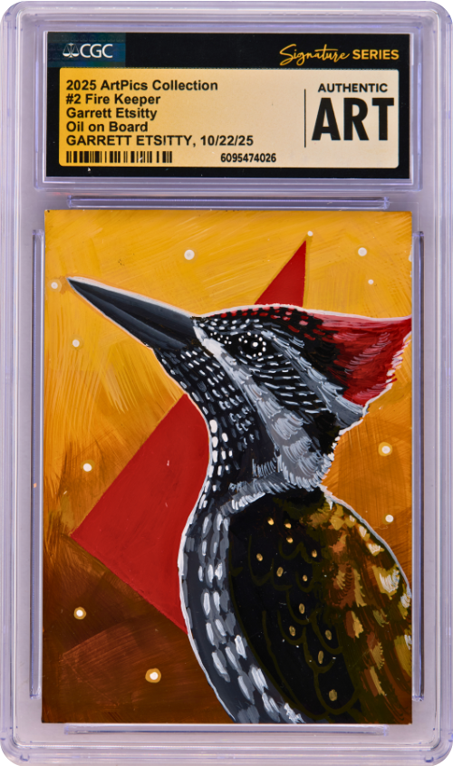 This ArtPics card features original artwork by Garret Etsitty, titled #2 Fire Keeper. Each piece is a one-of-a-kind art card, authenticated, date-stamped, and encapsulated in a UV protected tamper-proof holder. Each card has a unique NFC chip attached where the card has been minted on the blockchain for additional security purposes and as the Official Certificate of Authenticity.
