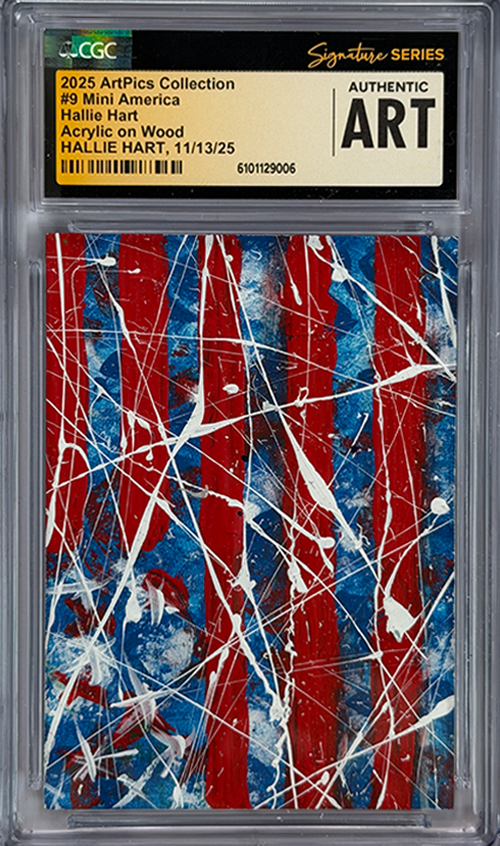 This ArtPics card features original artwork by Hallie Hart, titled #9 Mini America. Each piece is a one-of-a-kind art card, authenticated, date-stamped, and encapsulated in a UV protected tamper-proof holder. Each card has a unique NFC chip attached where the card has been minted on the blockchain for additional security purposes and as the Official Certificate of Authenticity.