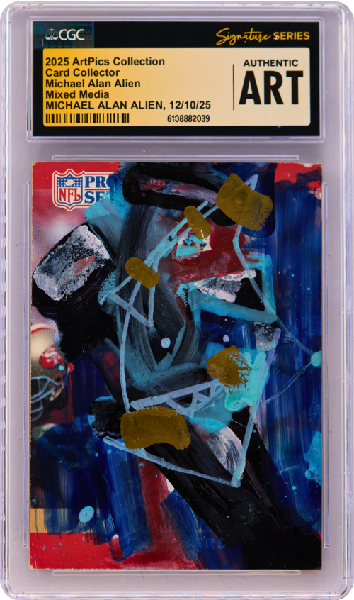 This ArtPics card features original artwork by Michael Alan Alien, titled Card Collector. Each piece is a one-of-a-kind art card, authenticated, date-stamped, and encapsulated in a UV protected tamper-proof holder. Each card has a unique NFC chip attached where the card has been minted on the blockchain for additional security purposes and as the Official Certificate of Authenticity.