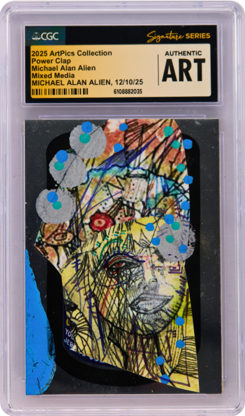 This ArtPics card features original artwork by Michael Alan Alien, titled Power Clap. Each piece is a one-of-a-kind art card, authenticated, date-stamped, and encapsulated in a UV protected tamper-proof holder. Each card has a unique NFC chip attached where the card has been minted on the blockchain for additional security purposes and as the Official Certificate of Authenticity.