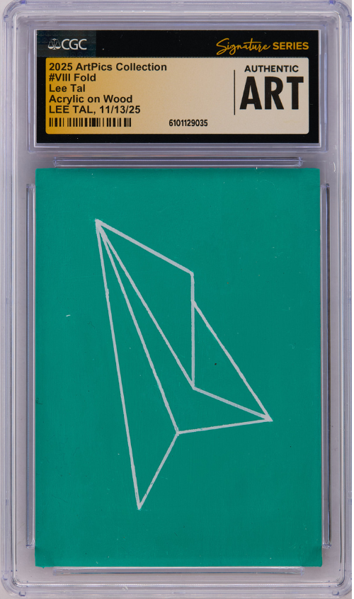 This ArtPics card features original artwork by Lee Tal, titled #VIII Fold. Each piece is a one-of-a-kind art card, authenticated, date-stamped, and encapsulated in a UV protected tamper-proof holder. Each card has a unique NFC chip attached where the card has been minted on the blockchain for additional security purposes and as the Official Certificate of Authenticity.